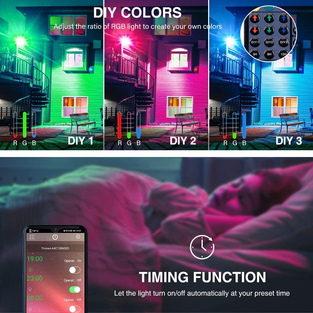 【Timing & Memory Function】You can set a schedule for your flood light, then it will automatically turn on/off at your preset time. With the memory function, the light will retain the same color, mode, speed and brightness as the previous time.