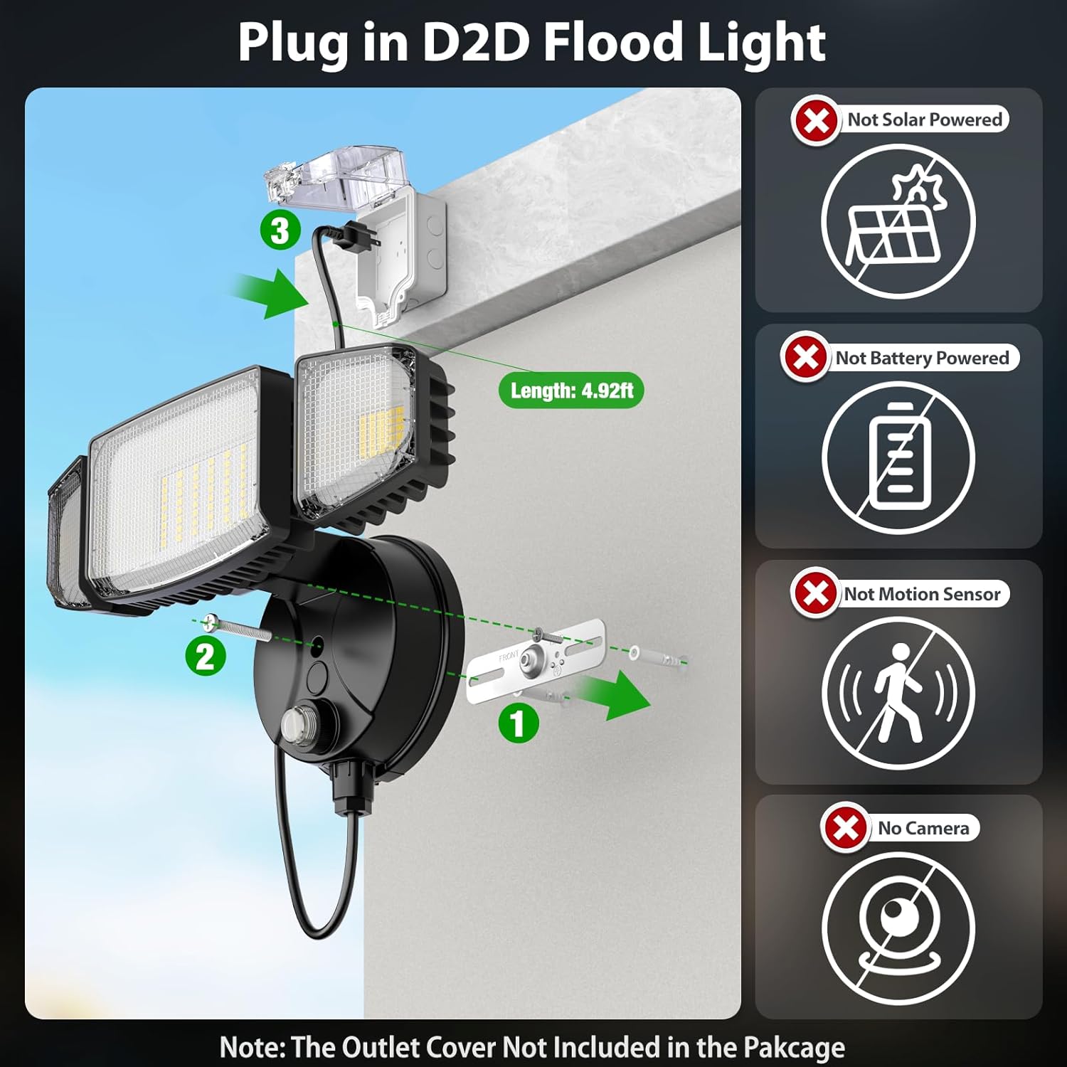 - Plug-in Design & Effortless Installation: Featuring a plug-in design with a 4.9ft power cord, this outdoor plug-in flood light requires no complex wiring or professional help. Just plug it into any standard wall outlet and secure the base—enjoy instant, bright illumination in minutes